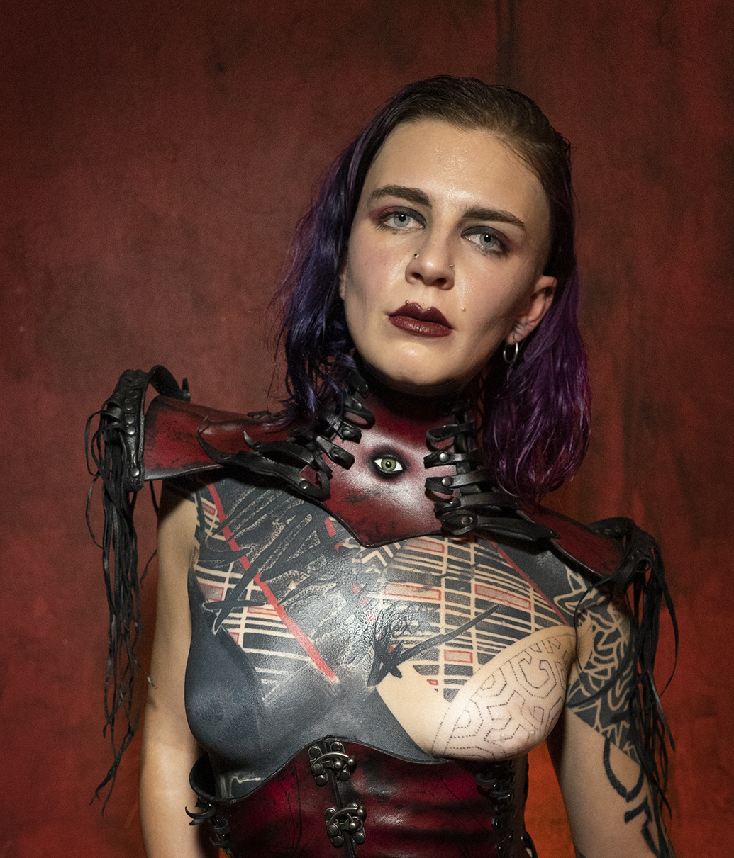 Sculpted leather neck corset with Glass Eye. Wearable art, sculpted, painted, hand made in Berlin. Adjusable in the Back.